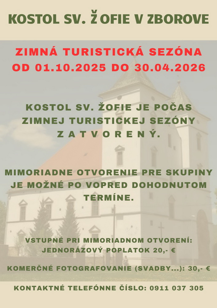 Od 01.10.2025 do 30.04.2026 budú obidve pamiatky zatvorené. Mimoriadne otvorenie pre skupiny bude možné po vopred dohodnutom termíne na Obecnom úrade v Zborove (0911 037 305).